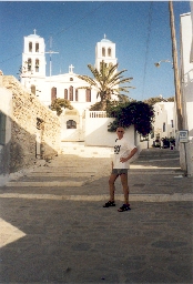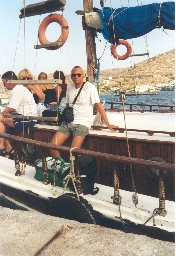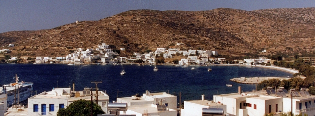 Wir bringen die letzten Ansichtskarten zum kleinen Platz, schauen noch zum Georgios Beach hinunter (da gibt es eine Menge Pensionen, Studios und Hotels in ruhigen Nebenstraßen - mit GW hab ich ja hier schon einmal gewohnt). Beim Bezahlen werden wir dann auf Kuchen, Kaffee und Tee eingeladen, Evangelos bringt uns in den Hafen. Unser Schiff, die Skopelitis, legt mit 55 Minuten Verspätung ab, an Bord sind ca. 30 Touristen. Wir steuern einige der kleinen Kykladen an, für einen Urlaub scheinen alle zu klein zu sein. In Katapola sehen wir bei der Einfahrt schon die Pension Big Blue über dem Hafen (direkt unter der Kirche) und da wir unter den auf die Touristen wartenden Zimmervermietern auch jemanden mit diesem Schild sehen, gehen wir gleich auf ihn zu, Zimmerpreis ist DRX 5.000,- und wir sind uns sofort einig. Ein Junge trägt L.s Koffer die Stufen hinauf, die Aussicht über den Hafen ist toll! Hier scheint sich (nach einem ersten Rundgang) nicht viel geändert zu haben, die Touristen werden von den Einheimischen noch alle auf der Straße gegrüßt, alles sehr freundlich, nur Internetzugänge gibt es (wie auch schon auf Naxos) fast überall. Einen leichen Sonnenbrand im Nacken hab ich mir bei der Schiffsfahrt auch zugezogen. Die Erkundung der beiden "Reiseagenturen" (alle inzwischen online und mit genauer Registrierung der Passagiere) ergibt, daß man wirklich nicht mehr direkt nach Santorin fahren kann, daß aber mittwochs um die Mittagszeit eine Fähre nach Ios geht, von dort sollte man eigentlich problemlos nach Santorin weiterkommen.
