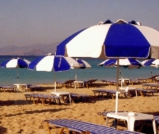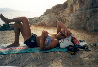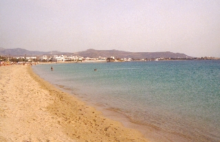 Es ist wieder leicht bewölkt und wir fahren um 09:30 wieder nach Prokopis. Da der Wind ablandig ist gibt es heute praktisch keine Wellen. Es ist ein sehr ruhiger Tag, ich schlafe auch am Strand, lese viel und bekomme einen leichten Sonnenbrand auf der rechten Schläfe und auf der Nase. Um 17:00 zieht es von Paros kommend etwas zu und wir "wandern" nach Agia Anna und fahren von dort mit dem Bus (kostet um DRX 100,- mehr als von Prokopis) zurück nach Naxos. Wie kaufen wieder eine Zitronenlimonade und Wasser und gehen etwa um 18:30 Postkarten kaufen. Wir essen im Kastro oben auf der Terrasse Schaffleisch mit Erdäpfel und Aubergine, dazu Skordalia bzw. Tzatziki und mit Spinat gefüllte Teigtaschen. Anschließend trinken wir noch einen Cocktail am kleinen Platz (Dikastirio). |