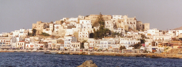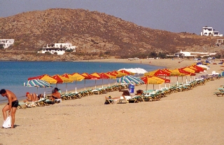 erfahre, daß wir von dort nicht direkt nach Santorin kommen. Am Strand (schön und ruhig wie immer) essen wir gleich einen Pfirsich und gehen gleich ins glasklare Wasser. Der Tag vergeht (wie so oft hier auf Naxos) ohne irgendwelche Höhen oder Tiefen, Micha und Pat haben sich nicht mehr gemeldet. Weil wir uns auch den Georgios Beach anschauen wollen fahren schon um 17:00 zurück in die Stadt. Heute gibt es im Zimmer auch Badetücher, die bisher anscheinend vergessen worden waren, die Klimaanlage funktioniert wahrscheinlich nur gegen Aufpreis (keine Fernbedienung im Zimmer) und im TV gibt es leider nur griechische Programme.