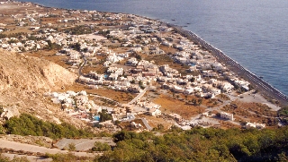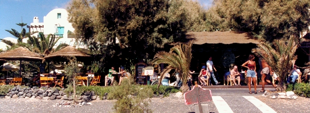 Um 10:00 sind wir dann in Kamari, noch ist relativ wenig los (vor allem, wenn man bedenkt, wieviel heuer in Perissa noch los ist!), TUI-Center gibt es keines, eine Dame von All-Tours versucht für mich anzurufen, es hebt aber niemand ab, aber die Nummer hab ich jetzt wenigstens. Wir bleiben bis 17:30 und wollen dann mit dem Boot zurück nach Perissa, erfahren aber, daß das 17:00-Boot das letzte war. Nach kurzer "Beratung" gehen wir über den Berg zurück: oben am Paß ist es jetzt nicht windig - es stürmt, trotzdem sind wir um 19:00 zuhause. Wir essen in der Meerjungfrau gefüllte Tomaten (nicht ganz so gut wie auf Amorgos), Papoutzaki (sehr gut), Moussaka (gut), Dolmades, die sogar L. schmecken und ein Tzatziki, wofür wir mit 3 Bier DRX 7.100,-- zu bezahlen haben. Bei Dave trinken wir noch 2 Bier und 2 Baileys und werden von Fred aus Wagrain (Riverside 48) auf 1/8 in der Beachbar eingeladen. |